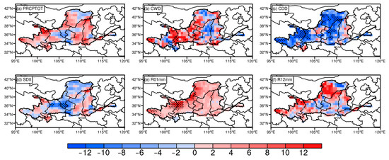Spatial distribution of differences (defined as (Y − N) × 100/N; unit: %) in summer precipitation indices under RCP4.5 over the YRB. (a) PRCPTOT; (b) CWD; (c) CDD; (d) SDII; (e) R01mm; (f) R12mm.