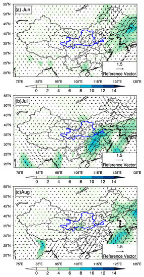 Differences (defined as Y minus N) in the integrated water vapor flux (shading, unit: kg·m−1·s−1) and wind field (vector, unit: m·s−1) at 850 hPa under RCP8.5 from June to August. (a) June; (b) July; (c) August.