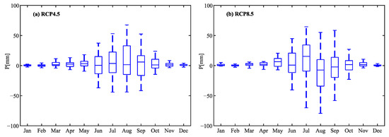 Variation of monthly precipitation with irrigation under the RCP4.5 (a) and RCP8.5 (b).