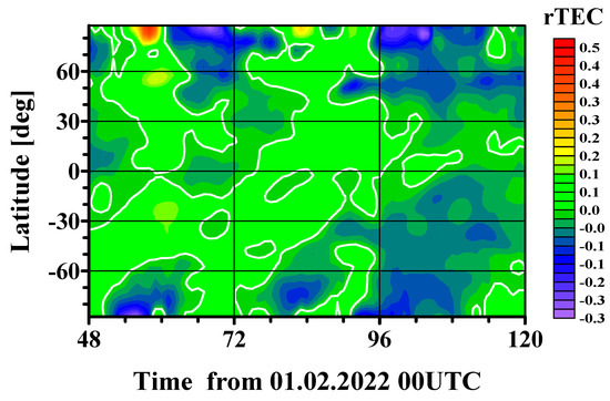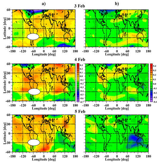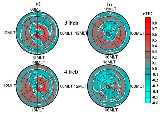 3.3. Variability of the Spatial Distribution of the TEC Response for the Period 3–4 February as Shown by CODE Data