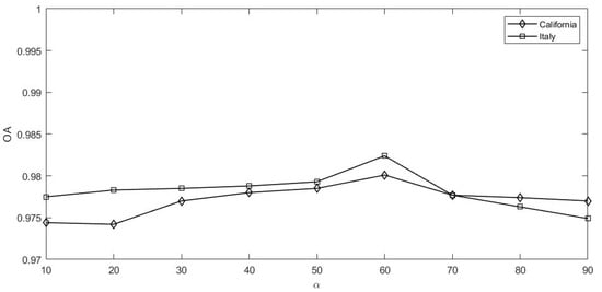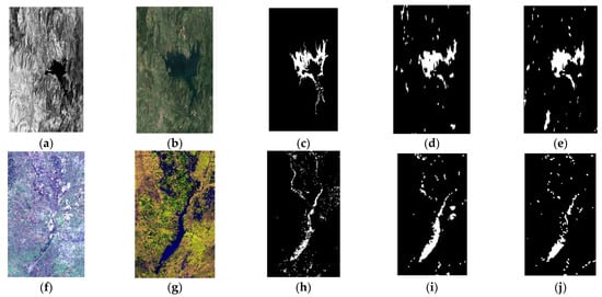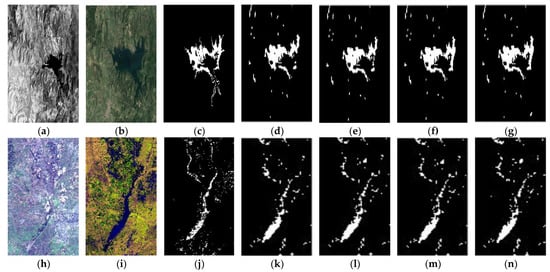We used two typical data sets to verify our method. The Italy data set includes one near-infrared band image and one optical image, taken over Sardinia, Italy in September, 1995 and July, 1996, respectively []. The former derives from Landsat-5 and the latter from Google Earth with R, G, and B bands. The multitemporal images indicate the event of lake expansion, with a resolution of 30 m. The California data set includes a multispectral image, with eight channels taken by Landsat 8, and an SAR image with VV and VH polarizations taken over California on 5 January 2017, and 18 February 2017. The multitemporal images indicate a flood in this area []. The description of this data set is given in Table 2.