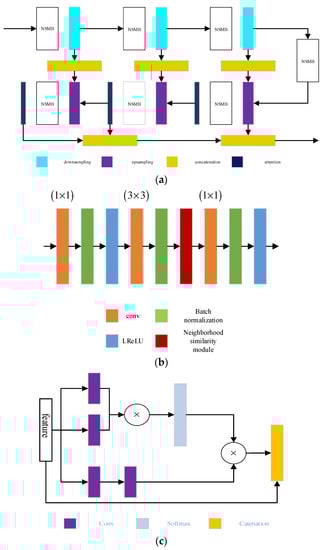 The detailed structure of our self-constructed network: (a) network structure; (b) NSMB module; (c) neighborhood similarity module.