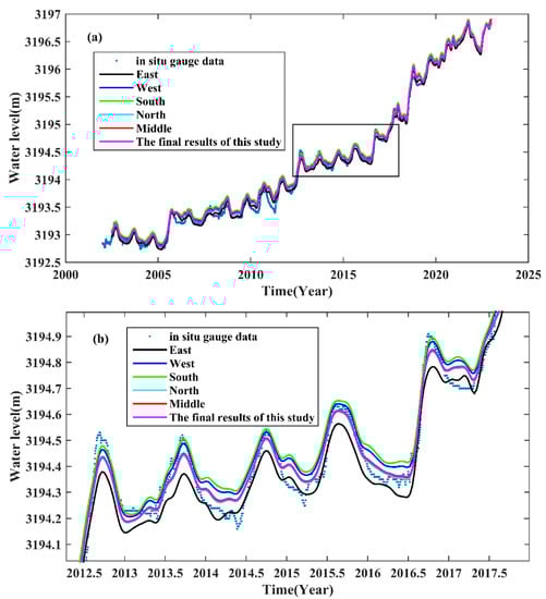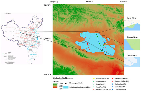 We are very grateful to the European Space Agency for providing the Envisat RA-2 and Sentinel-3A/B SRAL altimeter data (https://earth.esa.int/ (accessed on 1 February 2023)); the Archiving, Validation, and Interpretation of Satellite Oceanographic data (AVISO) for providing the Jason-1/2 and SARAL sensor data record (SGDR) (https://www.aviso.altimetry.fr/ (accessed on 3 February 2021 and 20 January 2023, respectively)); the European Centre for Medium-Range Weather Forecasts (ECMWF)for providing the surface pressure and vertical integral of water vapor data (https://apps.ecmwf.int/datasets/data/interim-full-daily/levtype=sfc/ (accessed on 3 February 2023)); the Geospatial data cloud for providing the Landsat-5 Thematic Mapper (TM), Landsat-7 Enhanced Thematic Mapper (ETM), and Landsat 8 Operational Land Imager (OLI) data (http://www.gscloud.cn/ (accessed on 25 December 2021)); the Qinghai Provincial Water Conservancy Bureau for providing gauge data (http://www.qhsl.gov.cn/ (accessed on 19 August 2021)); the Database for Hydrological Time Series of Inland Waters (DAHITI, https://dahiti.dgfi.tum.de/(accessed on 14 January 2023)), high-temporal-resolution water level data (HTRWLD, http://data.tpdc.ac.cn (accessed on 14 January 2023)), and Hydroweb (https://hydroweb.theia-land.fr/hydroweb/(accessed on 14 January 2023)) for providing datasets of Lake Qinghai; GSFC-NASA for GPM (Global Precision Measurement, https://disc.gsfc.nasa.gov/datasets/GPM_3IMERGDF_06 (accessed on 25 December 2021)) precipitation data; and the National Tibetan Plateau Data Center for providing the northern hemisphere lake ice thickness datasets (http://data.tpdc.ac.cn (accessed on 14 January 2023)).