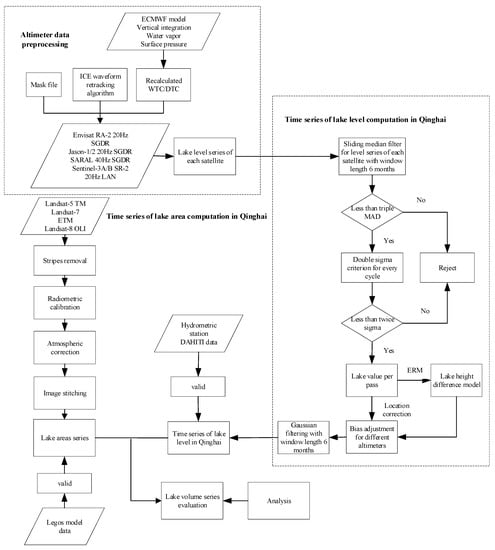 The data processing of LQ water storage variation is shown in Figure 2. It is mainly divided into four parts: the study of water variation based on multi-mission altimeter data; the study of lake area capture based on Landsat data; water level–area relationship fitting; and water storage estimation based on water level and area series. These are introduced separately in the following: