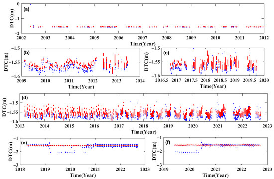 A comparison of the reprocessed DTC and products values. (a–f) The Envisat RA-2, Jason-1, Jason-2, SARAL, Sentinel-3A SRAL, and Sentinel-3B SRAL satellites, respectively, until September 2022. Red represents the reprocessed data, and blue represents the values of the products.