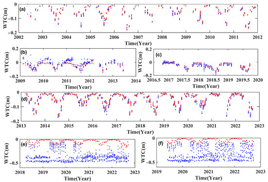The comparison of the reprocessed WTC and products. (a–f) The Envisat RA-2, Jason-1, Jason-2, SARAL, Sentinel-3A SRAL, and Sentinel-3B SRAL satellites, respectively, until September 2022. Red represents the reprocessed data, and blue represents the product values.