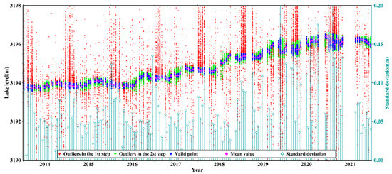 When computing the average lake water level for each pass, outliers were removed. A sliding median filter algorithm and 2σ were employed in this research to find outliers [49]. The steps were as follows:
