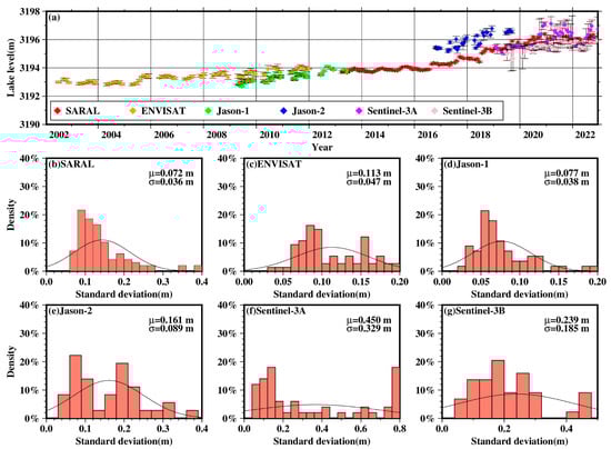 (a) The averaged Lake water level per cycle measured by satellites; (b–g) histogram distribution of standard deviation of lake water level for the SARAL, Envisat RA-2, Jason-1, Jason-2, Sentinel 3A SRAL, and Sentinel 3B SRAL satellites, respectively.