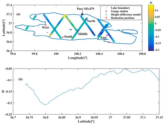 (a) Lake height difference model constructed using data from ERM missions; (b) lake height difference in Pass No. 479 area.