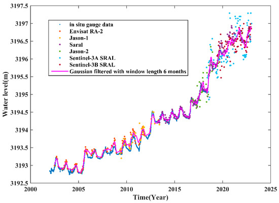 Due to the existence of objective influencing factors, such as instrument and equipment errors, in satellites, the inconsistent reference ellipsoid data, orbit inclination, and revisit period, there are systematic deviations among altimeters in the process of multi-mission altimeter data fusion, and different altimeters data cannot be connected accurately. There are still some systematic deviations in the water level time series after eliminating gross errors and outliers [50]. Multi-mission satellite data generate a continuous time series through deviation correction, which is important for the construction of lake water levels in continuous time series [51]. The steps for deviation adjustment in this paper were as follows:
