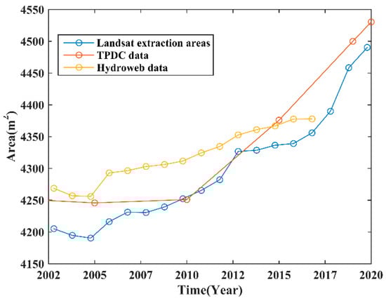 The area series of LQ extracted from the Landsat image is consistent with the changing trend of Hydroweb data, with a correlation of 0.9855 and an RMS of 55.608 km2. With time, the absolute value of the difference between them is becoming smaller and smaller, which shows that the increasing speed of the main lake area is gradually speeding up or the percentage of the sub-lake area is gradually slowing down. All of the validation results suggest that Landsat images perform well in extracting water bodies from the Qinghai Lake area; hence, the multi-year area data obtained using Landsat images can be considered reliable.