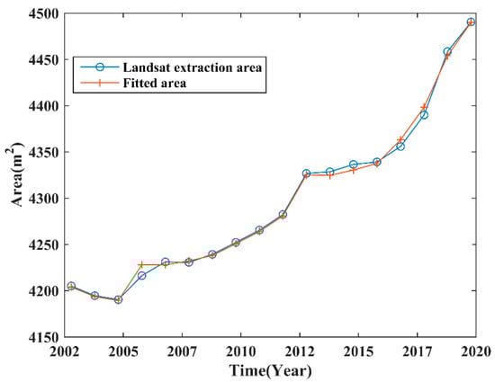 It should be noted that the fitting relationship between the water level and the area is based on the average data from September to November, and the average water level of lake in Formula (10) indicates the average area of lake in that year. For the determination coefficient, . The area fitted by Formula (10) was compared to the water area determined using remote sensing images to validate the fitting effect. The fitted area is similar to the Landsat water area, and the maximum and minimum percentage differences are 0.28% and 0.0044%, respectively, indicating that the fitted result of water level and area is good, as seen in Figure 15.