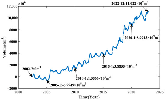 The final result obtained from satellite altimetry was substituted into Equation (9) to obtain the water storage variation time series, and the water storage time series growth in LQ from May 2002 to December 2022 was obtained via cumulative calculation, as shown in Figure 16. From July 2002 to December 2022, the water volume of LQ increases by 11.022 × 109 m3, with an annual growth rate of 5.3766 × 108 m3. The overall trend increases in fluctuation. From July 2002 to January 2005, the water storage of LQ displays a decreasing trend, with a total decrease of 5.9949 × 108 m3. After this period, the water storage of LQ increases in fluctuation, and by January 2010, the water storage increases by 1.5566 × 109 m3 compared with July 2002. From January 2005 to January 2010, the water storage increases by 2.1561 × 109 m3, so the increased speed from January 2005 to January 2010 is 4.312 × 108 m3/a. The rising rate is 4.6578 × 108 m3/a from January 2010 to January 2015, which is comparable with the conclusion estimated by Zhang et al. (2018): the rising rate of LQ from 2001 to 2016 was 4.5 × 108 m3/a [27]. From January 2005 to January 2015, the rising rate is 4.4850 × 108 m3/a. From August 2016, the water level shows a rapid growth trend. Figure 16 shows that the rising rate from January 2015 to December 2022 is 8.9206 × 108 m3/a. The increased rate of lake water storage in LQ in the last 20 years tends to increase.