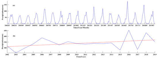 Precipitation on LQ from 2002 to 2019. (a) the variation of monthly cumulative precipitation. (b) the variation of annual average precipitation.
