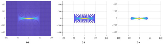 Figure 2. The contours of the ambiguity function. (a) Projection of the ambiguity function; (b) height is set to 0.1 times the peak of the ambiguity function; (c) height is set to 0.3 times the peak of the ambiguity function.