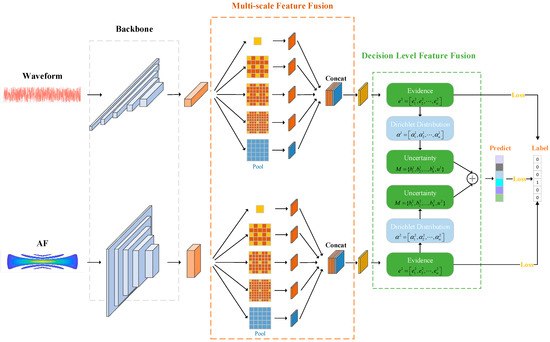 • Multi-scale fusion module. The original waveform and the contour line of the AF are used as the input of this module. A backbone network is constructed to extract features from the multi-view input and then a multi-scale feature fusion layer is employed to fuse features from multiple scales of each view. Convolution kernels of different sizes are adopted in the multi-scale layer.