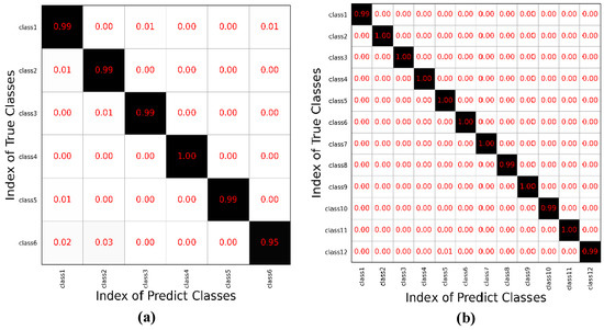 Figure 5. Confusion matrix of MAFN. (a) Result on dataset 1. (b) Result on dataset 2. The column of the matrix represents the predicted class of samples, while the row represents the true class of samples. The numbers in the non diagonal element represent the incorrect recognition ratio. The numbers in the black background along the diagonal represent the correct recognition ratio of each class.