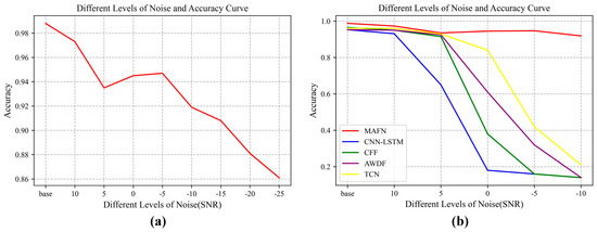 The robustness of REI is important in real applications because the assumptions of deep learning are so ideal that the model trained on the training set could not adapt well to the changing test set. To investigate the robustness of the proposed MAFN when the quality of the test data changes, dataset 1 is used as an example to add noise to the test. Gaussian noise is added to the signal to test the classification accuracy of the model. Signals with different SNRs are considered, ranging from −10 dB to 10 dB, and, in order to test the performance of our model in extreme scenarios, the lowest SNR is set to −25 dB. The quantitative results of the classification by MAFN are calculated. In addition, several related methods are compared with MAFN, including CFF [30] (feature-level stacked fusion method), adaptive weights decision fusion (AWDF) [31] (decision-level fusion method using adaptive weights), TCN [32], and CNN-LSTM [33] methods for REI. The experimental results of different networks are shown in Figure 6, where Figure 6a shows the variation of classification accuracy of our proposed algorithm MAFN with the SNR and Figure 6b shows the comparison results with other methods. By synthesizing multi-view information in the feature extraction for classification, MAFN is robust to signal degradation. From the results, we can observe a remarkable improvement of MAFN over other methods as the SNR decreases.