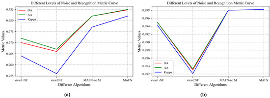 The results show that all three networks achieve high classification accuracy for the designed multi-scale layers. It is well known that a single-scale convolution kernel can only extract local features within a certain receptive field. In the multi-scale fusion module, by using different scales of convolutional kernels in the same view, local and global information in signals can be extracted separately and then fused more comprehensively for the final decision. By adaptively adjusting the weights for the fusion of different views, MAFN can provide more reliable results at the evidence level. Compared with the single-view networks without fusion strategy (View1-NF and View2-NF), the performance of MAFN with feature fusion is better in OA, AA, and kappa coefficients, which confirms the effectiveness of fusing multi-view information. The confusion matrixes of the classification results on the two datasets by MAFN are shown in Figure 5a,b, respectively.