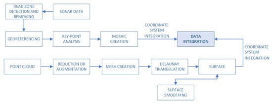 This subsection describes the processing of bathymetric data and sonar images to create a merged underwater surface. The proposed approach is based on processing obtained data and its combination. It is done by analyzing the points clouds and their verification by a developed condition that can be interpreted as decision-making. Then, these points are used to create a surface that will get the sonar data as a georeference. A simplified step-by-step process as a schema as shown in Figure 1. Integration of underwater data is based on the combination of two selected data, i.e., a point cloud and signal reflection data obtained from sonar. The integration of these data is to enable merging by using sonar to obtain details on the surface designated with MBES data. Such integration allows merging selected types of data (placed in the database) to get the correct visualization and analysis capabilities.