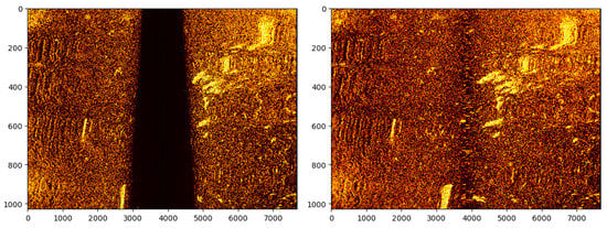 Our sonar data processing proposal is based on the analysis of files obtained from the side-scan sonar. As a result, data are presented as a set of signal reflection values from the bottom or obstacle. Hence, sonar data contain data on the left and right sides of the Sonar. The space under it is the so-called dead zone that has not been examined. The first step in such an analysis is to generate an image based on the value of reflection signals from Sonar. Then, with the help of an edge detection algorithm, we detect the dead zone area, which is removed. The image on the left and right are sewn (but on the same dimension—see Figure 2). Having such an image, it remains only to make a georeferencing, which is possible by collecting the value of starting coordinates and the end of sonar measurements (these values are available as metadata in XTF files). The georeferencing is based on determining value for each pixel. This is performed by determining the values using the estimation of how far the sonar beam reaches, which allows you to determine two coordinates for a pixel in the middle and border. The coordinates of the points between are determined by dividing the distance between these points by the number of desired points. As a result, these points are equal to each other [36]. Mosaic can be based on applying images with a coordinate system. However, there are quite often deviations or problems in sonar measurement. Hence, we suggest the additional use of stitching algorithms based on key points analysis to match these images. Finally, the image was created by applying sonar images and their matching creates a sonar mosaic, which is exported to the geotiff file, containing the image and coordinates of these pixels.