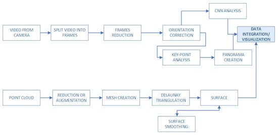 In the case of videos recorded with ordinary cameras, the number of frames to process is huge and not needed. Hence, we propose to analyze the frames at a constant time interval t (e.g., or ). The next problem is the shoreline on the frames. The recorded image will also contain a portion of the water surface that should not be analyzed. For this purpose, we propose to trim each frame in relation to the borderline. It can be done by using an image-processing filter (edge detection, reduction), and interpolation, or some segmentation by the u-net models [37] (both cases are discussed below). If the image becomes skewed about the shoreline trim, it should be rotated by simple image processing. Then each frame can be treated as an image and key-point analysis can merge all these images into one stitched view that can be added to the surface. The Proposed technique is based on a combination of different approaches like image processing, machine learning and cloud points analysis. A visualization of these steps is shown in Figure 3.