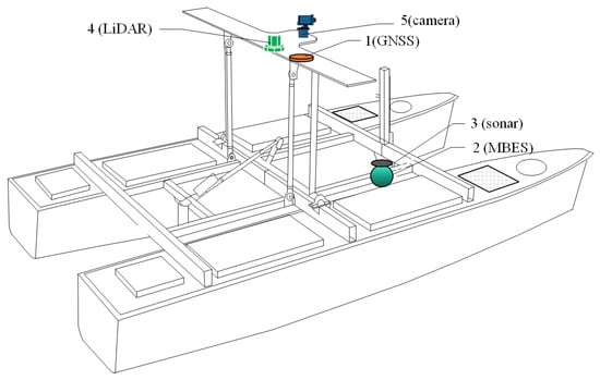 Sensors mounted on an autonomous unmanned hydrographic vessel: 1—global navigation satellite system (GNSS) receiver, 2—multibeam echosounder (MBES), 3—sonar, 4—light detection and ranging (LiDAR), 5—camera.