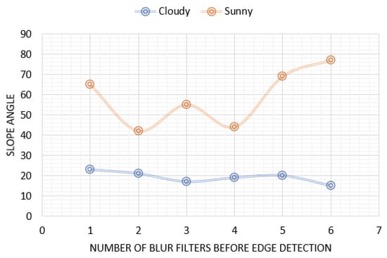 At first, we analyzed the method for removing the area above the shore. The size of the recorded video was (it was resized due to a large number of calculations). For this purpose, we analyzed different image processing techniques like blur and edge detection. A blur decreases the number of points detected after the edge detection filter, and different numbers of blur filters to remove pixels and edges were applied. The mean slope angle about the shoreline based on 20 different frames is shown in Figure 7. For this purpose, all remaining pixels were used in the linear approximation of the line. The perfect case is because of the uneven edge of the shoreline. It could be seen that the results indicated low accuracy because of different weather conditions. On a cloudy day, image processing showed much better adjustment. Another situation was when the image was recorded on a sunny day. Then the sun’s rays were reflected on the water’s surface creating a greater number of detected edges. As a result, the shoreline, after linear interpolation of the remaining pixels, did not match the existing one. The other problem was that there were different objects on shore. This causes many filtering problems. Based on the results, the best-fit line came from a double-blur operation before edge detection.