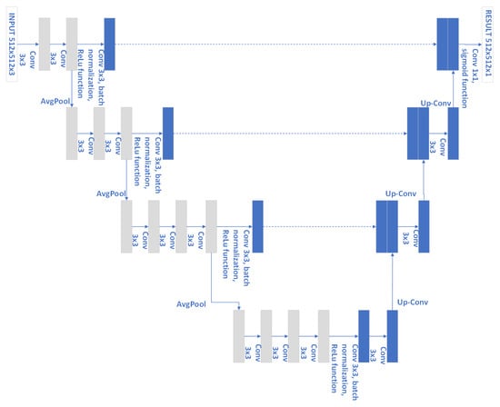 An alternative approach is to use the u-net model, which is a neural network architecture [41]. The network takes the image and returns its modified version. The model assumes the construction of a network with convolution layers (using the Equation (4), but the filter values are found during training), and pooling (reduction of the input image size). Such layers contribute to the extraction of the most important features, which are then used in the image reconstruction process. This occurs through the layers of convolution and up-convolution (the opposite of pooling). The u-net model is trained on a supervised basis, i.e., the network processes the image during training, and verifies the result of the network against the desired modification.