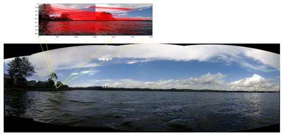During the case study (the measurements made in March and June), we notice that there is no easy answer for how many frames should be used to create a stitched image. The measurements were carried out parallel to the shore, where the camera measurement returned about 50% of the rotation, i.e., 180 degrees. 50 frames were used for creating the above-water view, but after reducing them (due to the low-speed value) only 8 would be enough. Moreover, the proposed approximate approach to assigning the camera image to the surface was most often in the wrong places. Based on this research, future work will focus on georeferencing this more accurately.