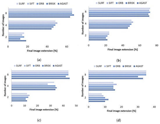 From the few films from which we extracted frames for each second, the tested image size was . We evaluated each of them by a selected key-point algorithm according to different [second], and 2, 4, 8 images merged into one texture. In Table 1, the mean time for 20 different tests are shown. It is worth noting that the sample processing time was similar due to different frame capture times. However, the fastest average time to process only two images was obtained by SIFT. However, for eight images, SURF and AGAST turned out to be the fastest. In the case of the proposed methodology, the algorithm will have to process many samples; therefore, based on the results, the SURF algorithm was the best choice. In the next step, we focused on the average coverage in relation to the fit. An exemplary fit is shown in Figure 10. It was noted that there was some overwriting of both images, which made cropping necessary. The results of the fit measurements were made by analyzing the extension of the basic image. The results of these measurements are presented in Figure 11a–d. The best ones were obtained for the analysis and the combination of frames shifted in time by two seconds (see Figure 11b). In the case of a combination of eight images, the result expanded by more than 70% for each algorithm. For the combination of four, the image’s width increased by 50%. However, the results for the 1 s time shift (see Figure 11a) returned slightly worse results. When the shift increased to 3 and 4 s, the average coverage for the performed tests reached the maximum of 45% (for ) and 35% (for ) because the frames were too far apart, as can be seen in Figure 11c,d. As a result, the algorithms quite often did not find key points that could be used for the combination. It is also worth noting that the images were taken during the turns of the vehicle, which contributed to poorer performance with a higher time shift. For the algorithms, the results were similar, which means each of them is a good approach to creating combined images.