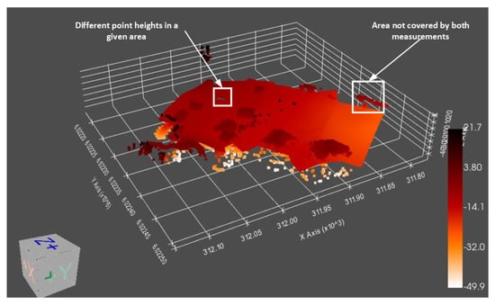 As part of the comparative analysis tests, two measurements were made nearly three weeks apart on the same reservoir. A water reservoir Zawory on 21 March 2022 and 2 June 2022. Prepared data without imposing textures made it possible to apply them by overlapping. The average value of the area coverage was 81% in terms of MBES and 60% in terms of LiDAR. However, the differences between the imposition were due to analyzes of a larger area than before (see Figure 12). This is due to the expansion of the analysis area and exchanges of the sensors to newer versions. Moreover, the data from 21 March 2022 shows some wrong data measurements due to the wrong reflection when using underwater sensors. As a result, erroneous measurement data exceeding the depth of the water reservoir were obtained. However, the very measurement of the bottom shows slight changes in the shape in selected places. To increase the accuracy of the overlay, the second area on 22 June 2022 was trimmed to the same area as in the previous measurements. 95% overlap was obtained according to MBES data (the analysis was made by dividing the area into 100 sub-areas). The analysis of the bottom surface showed no major differences and small deviations. First of all, slight changes in height at some points were noticed (it can be seen in the marked area in Figure 12). The reason for such actions may be a calibration problem or an obstacle from which the laser beam was reflected. However, changes in height are not regular in a given area, but only in selected points, which are not associated with changes at the bottom. Another observation resulting from the overlaying is related to noticing unanalyzed fragments of the bottom. This is due to the lack of ideal coverage of the area with measurement data due to slight modifications of the ship’s trajectory. Overlay analysis enables surface comparison in terms of points/meshes. However, in future work, we want to focus on the broader development of this analysis by using mass-learning algorithms for segmentation analyses. In addition, the texture is currently an add-on for better visualization. By implicating, textures can allow for a more accurate comparison by detecting individual elements/objects and automatically classifying them through knowledge transfer and the Yolo approach for analysis of not only images but the video.