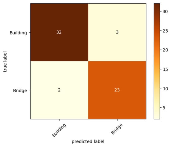 During conducting experiments, we also trained a YOLOv5 for analyzing camera data. For the purpose of training a set, we created a set composed of two classes: building and bridge. The building set contains 120 training and 35 testing samples (a sample was a frame from a video with the localization of an object). The bridge class has 80 training and 25 testing samples. The results of testing samples were shown as a confusion matrix in Figure 13. Based on the obtained results, for such a small number of training data, the classifier was able to reach 91.7% accuracy. It is a high result taking into account that the classifier was trained by 10 epochs with the ADAM algorithm. Such a trained network was used to evaluate camera data which can be seen in Figure 14. The images show a full model of processed data with the results displayed regarding the sum of buildings and platforms (the object was considered correctly classified when the probability of belonging to the class was a minimum of 80%).