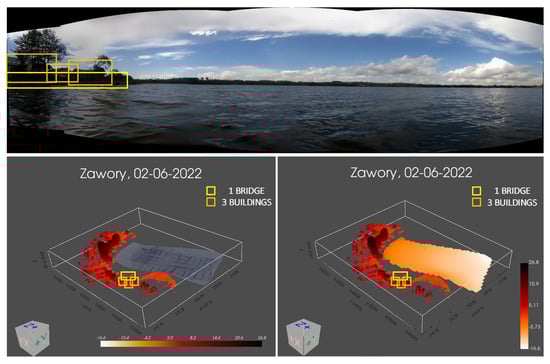 Moreover, images like stitched images from cameras can be analyzed by artificial intelligence methods. For this purpose, we use the type of pre-trained convolutional neural network called YOLOv5 [42]. The network returns the probability that detected objects belong to one of the known classes. In this way, you can easily determine the number of buildings around the water reservoir or bridges. In a similar way, we can perform an analysis of sonar images and classify objects such as logs or wrecks.