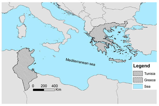 Land degradation was monitored in two countries of the Mediterranean basin, Greece on the northern side and Tunisia on the southern side (see Figure 1). Both countries are prone to land degradation processes, and cereal farming is essential to their food production. According to the reports submitted by both countries to the UNCCD through the PRAIS platform, the total degraded areas in 2015 in Greece were 16.22% and 12.6% of the total area, respectively [44].