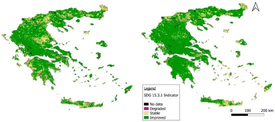 Figure 2. Spatial distribution of SDG 15.3.1 indicator in Greece during the baseline period (left) and the reporting period (right).