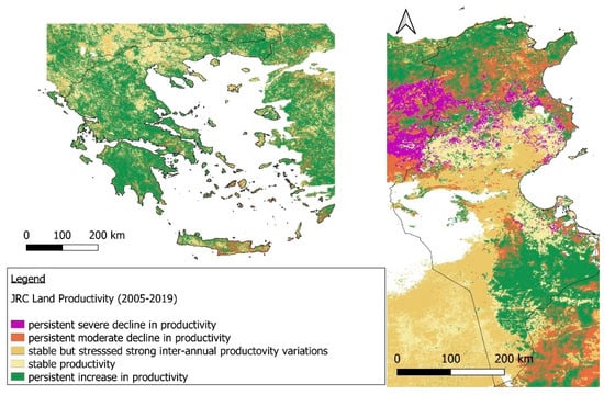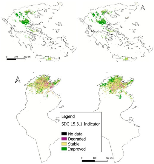 The spatial distribution of land productivity is very similar to that of the SDG 15.3.1 indicator (Figure 2 and Figure 3), in which improved land productivity in Greece and stable land productivity in Tunisia prevail during both periods. In the land productivity maps, the negative trend in land productivity is presented with a more detailed classification (Declining, Early signs of degradation, Stable but stressed) before classes are merged in the final class, “Degraded”.