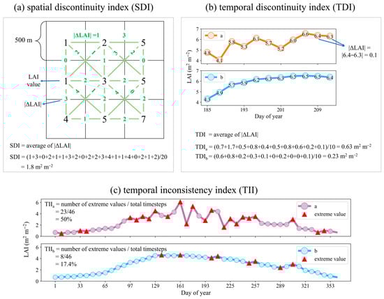 Schematic diagrams for calculating (a) spatial discontinuity index (SDI), (b) temporal discontinuity index (TDI), and (c) temporal inconsistency index (TII). represents the absolute difference between the adjacent LAI values. TDIs and TIIs of different time series were calculated as an example to exhibit different extents of (b) temporal discontinuity, and (c) temporal inconsistency.