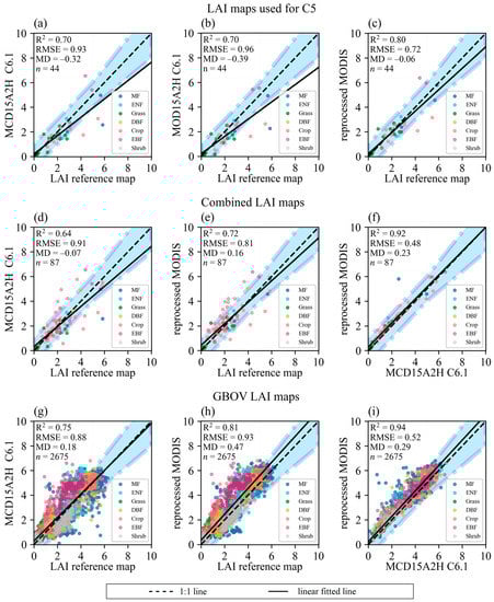 Validation of MODIS C6.1 LAI products and reprocessed LAI data against (a–c) reference maps used in the validation of MOD C5 LAI [55], (d–f) combined LAI reference maps (VALERI, BigFoot, Boston University, SMEX02, and ImagineS datasets), and (g–i) GBOV LAI reference maps. The shaded area stands for the uncertainty agreement ratio [1,74], and the distance between the diagonal and the upper or lower bound of the shaded area is equal to the greater 20% of the reference map value and 1 m2 m−2. “MD” is the average difference between the LAI values shown on the y and x axes.