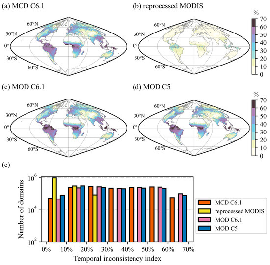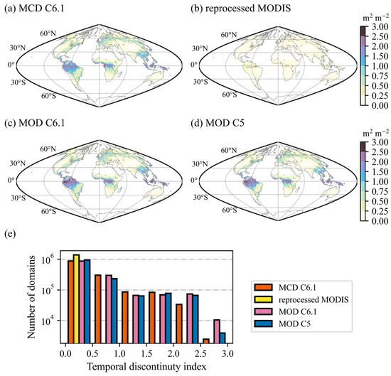 Temporal discontinuity index (TDI) maps of (a) MCD15A2H C6.1, (b) reprocessed MODIS, (c) MOD15A2H C6.1, and (d) MOD15A2H C5 LAI products for the 14-year (2013–2016) period, and (e) the numbers of domains in TDI maps over different intervals.