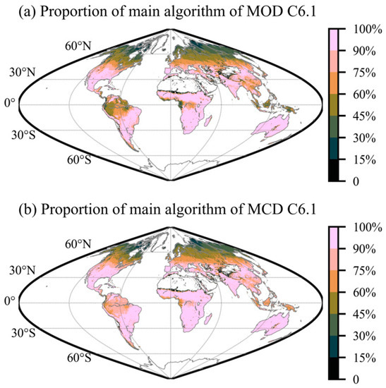 The quality difference between the MOD C6.1 and MCD C6.1 products was explored in Section 3.3 and Section 3.4. The MCD product was found to perform better in its temporal continuity and consistency near the equatorial region, which may be due to the different composition of the retrieval algorithms. We derived the proportion of these retrievals from the main algorithm during 2003–2021, and then aggregated the result into 10 × 10 km2 domains (Figure 9). The temporal ratio of the data that were retrieved from the main algorithms of both products was lower than 60% in northern high latitudes. The main-algorithm retrievals of the MCD product had a proportion of more than 75% in the Amazon region, southern China, southeast Asia, and middle Africa, while they were less than 60% for the MOD product in these regions, indicating that more LAI data were retrieved from the backup algorithm or not produced. More retrievals from the main algorithm improved the temporal continuity and consistency of the MCD data near the equatorial region. That is, the MCD product that was acquired from the combined satellites may have been able to capture more uncontaminated images, and thus had a higher chance of being retrieved from the main algorithm. Therefore, the MCD data were recommended for studies over the equatorial region.
