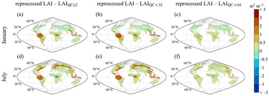 Difference between reprocessed MODIS LAI and MCD15A2H C6.1 LAI constrained by QC ≤ 2, QC < 32, and QC < 64 in (a–c) January, and (d–f) July of the year 2010.