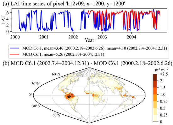 Difference in temporal mean value between MCD15A2H C6.1 and MOD15A2H C6.1 LAI products at (a) pixel ‘h12v09, x = 1200, y = 1200’ (lat = −4.998, lon = −65.250), and (b) the global scale. The black star in (b) indicates the location of the pixel plotted in (a).