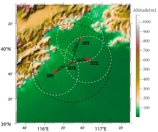 Distribution of radars (square signs and diamonds) and topography (coloring) of Beijing and its vicinity. The three square signs indicate the locations of the three X-POL radar sites (XFS, XSY, and XTZ). The diamond shows the location of the SDX site. The distance of each X-POL radar relative to the SDX site is labeled. The black dotted circle is the distance circle of the S-band with a 58 km radius, and the radius of the white dotted circles of the X-POL radar sites are 34 km, respectively. These circles show the detection zones of the CINRAD/SA and X-POLs where their minimum detectable reflectivity is less than −5 dBZ.