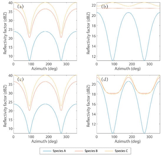 Azimuthal dependencies of the reflectivity factor for three species at the S-band (a,c) and X-band (b,d). As in (a,b), the elevation of the radar beam is 0.5°, which is the minimum elevation of VCP 21, and in (c,d), the elevation is 19.5°, which is the maximum elevation of VCP 21.