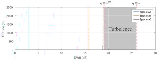 Unlike the differential reflectivity measured by means of two orthogonal signals that differ in polarization, the DWR describes the ratio of the radar reflectivity measured with two signals of different wavelengths. In Section 2, it has been found that biological scattering and turbulent scattering have different characteristics of the DWR. The DWR of Bragg scattering is dependent on the radar wavelength, as shown in Equation (9). Moreover, the DWR change in biological scattering is unpredictable because of the biologically complex shape. Hence, the predominant scattering mechanism can be determined by the DWR.