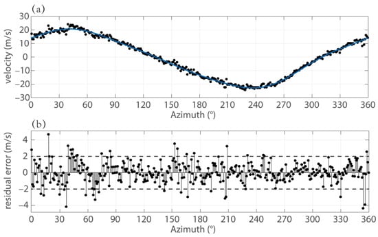 (a) An example of VAD data from the CINRAD/SA in Beijing. The line is the modeled radial velocities as a sine function of the azimuth, and the dots are the data of the Doppler velocity. The data samples are in the range of 30 km and the elevation of 2.4 deg. (b) The residual error (the dot) is essentially less than 2 m/s. The root mean squared error is 1.278, and the adjusted R-square is 0.9924.