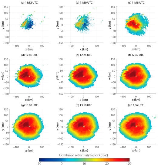Combined reflectivity factor for 2.4 h from the CINRAD/SA, 2 May 2021. (a–i) Continuous observations from the CINRAD/SA at 12 min intervals from 11:12 to 13:36. The horizontal and vertical coordinates are, respectively, the ranges (km) in the west–east direction and the south–north direction.