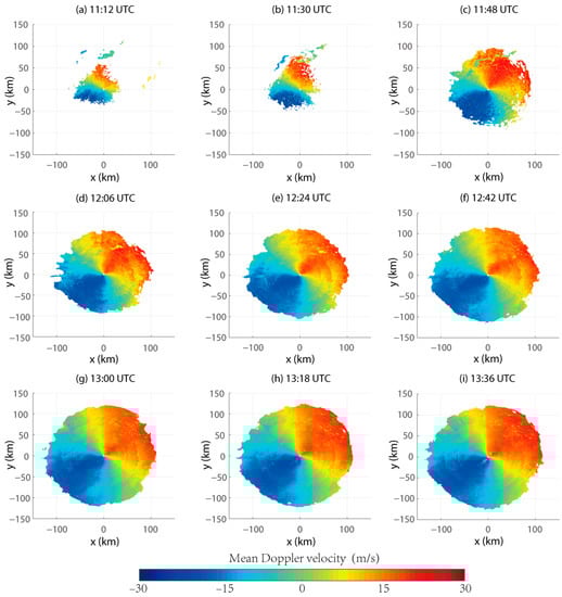 Mean Doppler velocity for 2.4 h from the CINRAD/SA, 2 May 2021. (a–i) Continuous observations from the CINRAD/SA at 12 min intervals from 11:12 to 13:36. The horizontal and vertical coordinates are, respectively, the ranges (km) in the west–east direction and the south–north direction.
