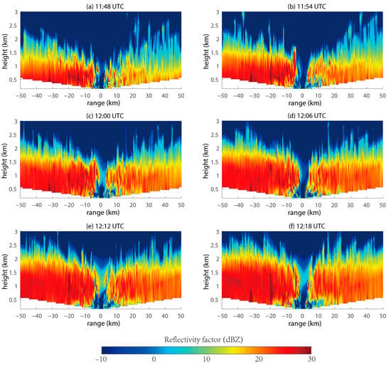 To confirm the state of the scatterers’ movement, in Figure 8, the range–height cross-section of is displayed in the azimuth of the wind direction. As shown in Figure 8, the signal was enhanced along the height at each range and did not change following wind direction. The phenomena discovered by Adriaan were not observed []. Paradoxically, the scatterer remained in the air, but the Doppler velocity was a nonzero value.